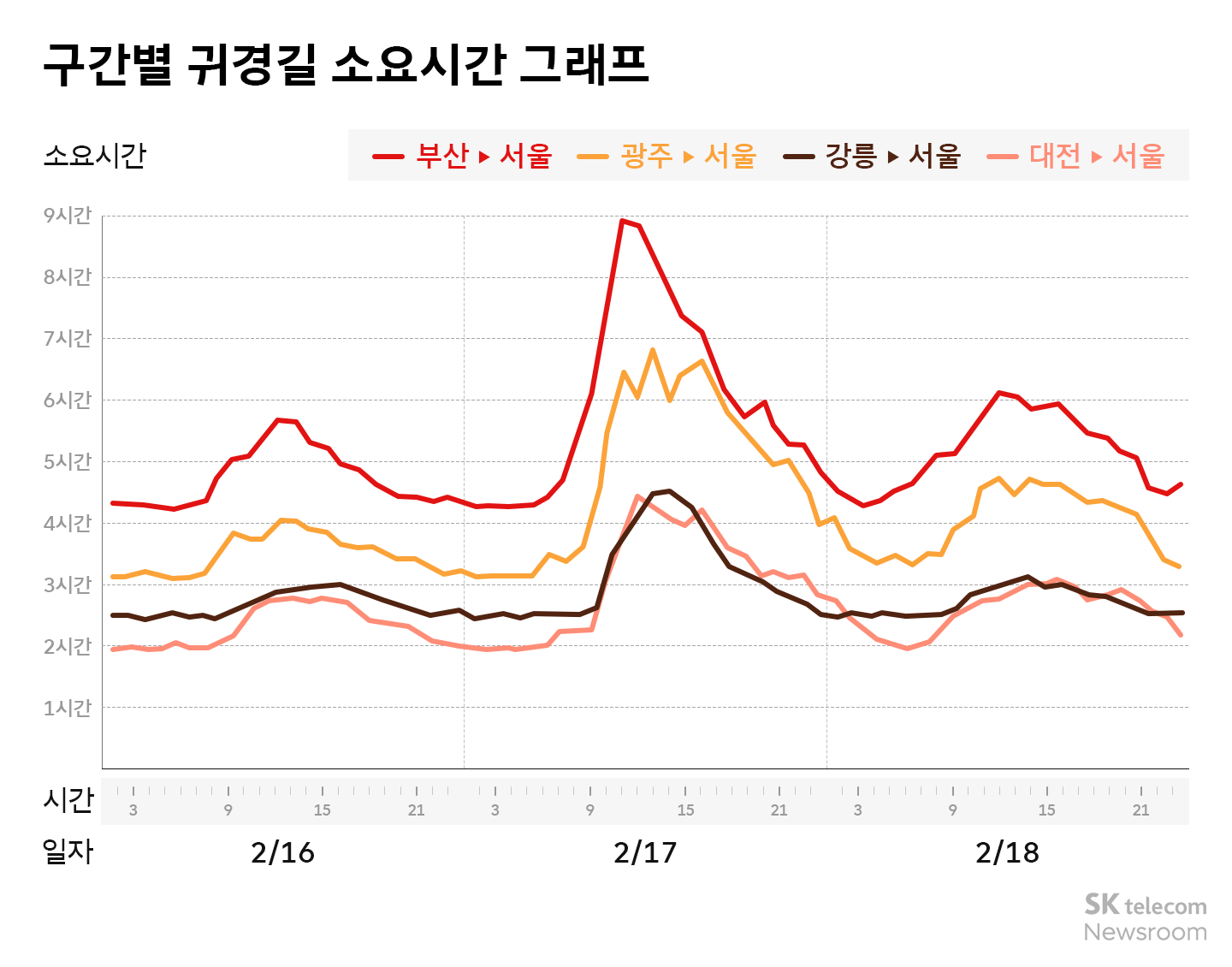 17일 오전 10시에 부산에서 출발해 서울로 이동할 경우 예상 소요 시간은 8시간 53분으로 평소 대비 2배 가까이 늘어난 수치다. 이는 이번 설 연휴 기간 티맵이 예측한 주요 구간별 소요 시간 중 최장 시간에 해당한다. 광주-서울 구간 역시 17일 12시 출발 기준 예상 소요시간이 6시간 45분으로 평소보다 2시간 30분 이상 더 걸릴 전망이며, 강릉-서울과 대전-서울 구간도 각각 13시와 11시경 출발 시 4시간 30분 내외로 가장 혼잡할 것으로 예측된다.