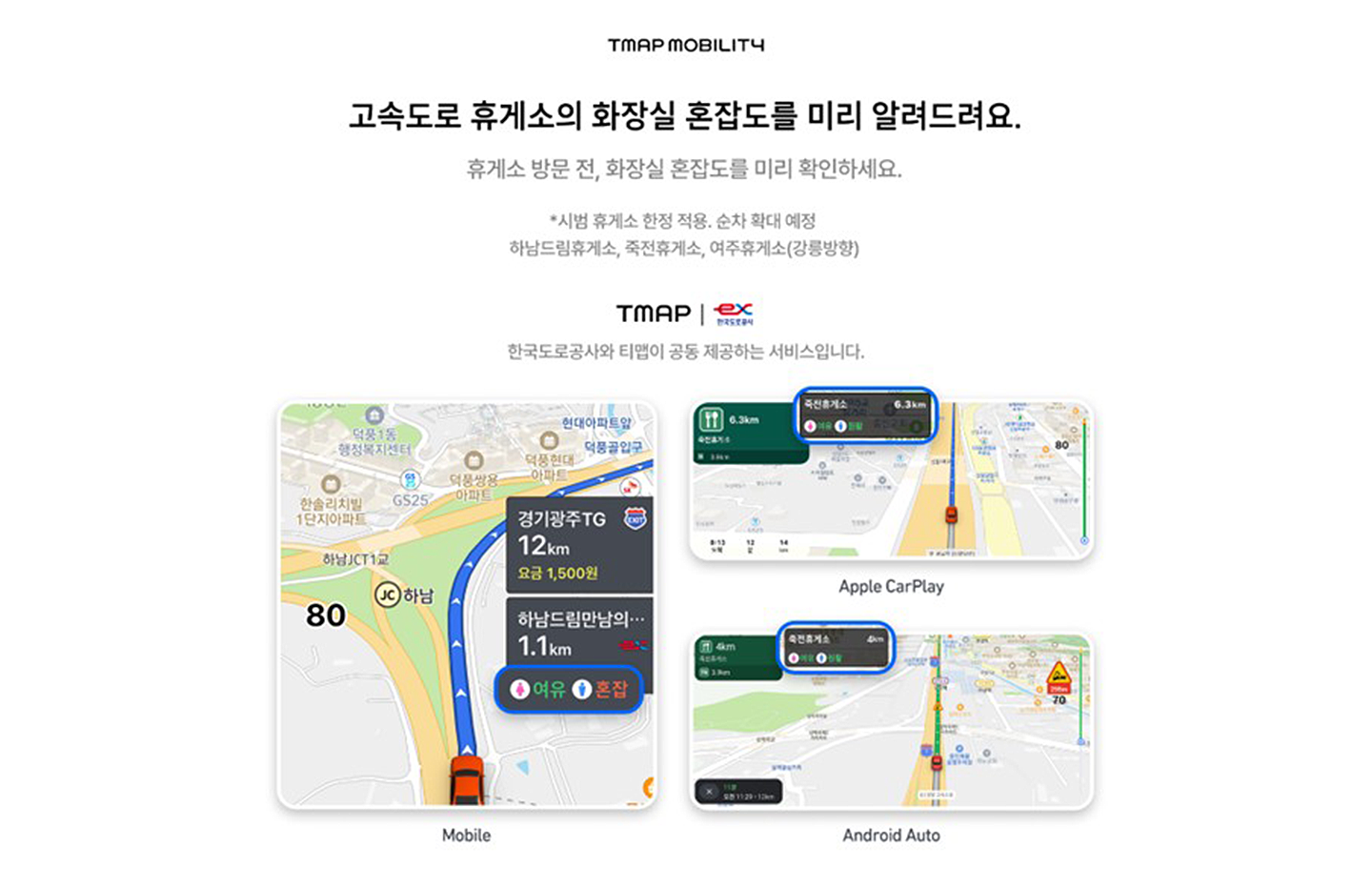 티맵모빌리티는 이번 설 연휴 기간 고속도로 휴게소 화장실 혼잡도 정보를 티맵 앱에서 제공해 이용자가 휴게소 방문 전 혼잡 상황을 미리 확인할 수 있도록 지원할 예정이다. 해당 서비스는 ▲죽전휴게소(서울 방향) ▲하남드림휴게소(상·하행 통합) ▲여주휴게소(강릉·서창 방향)를 대상으로 제공된다.