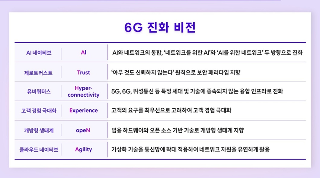 SKT는 이번 백서에서 △AI 기술의 네트워크 통합(AI 네이티브) △제로트러스트 보안 △5G∙6G∙위성통신을 아우르는 융합 인프라(유비쿼터스) △개방형 생태계 △가상화 기반 유연성(클라우드 네이티브) △고객 경험 극대화 등 6가지 방향을 네트워크 진화 비전의 핵심 축으로 제시했다.