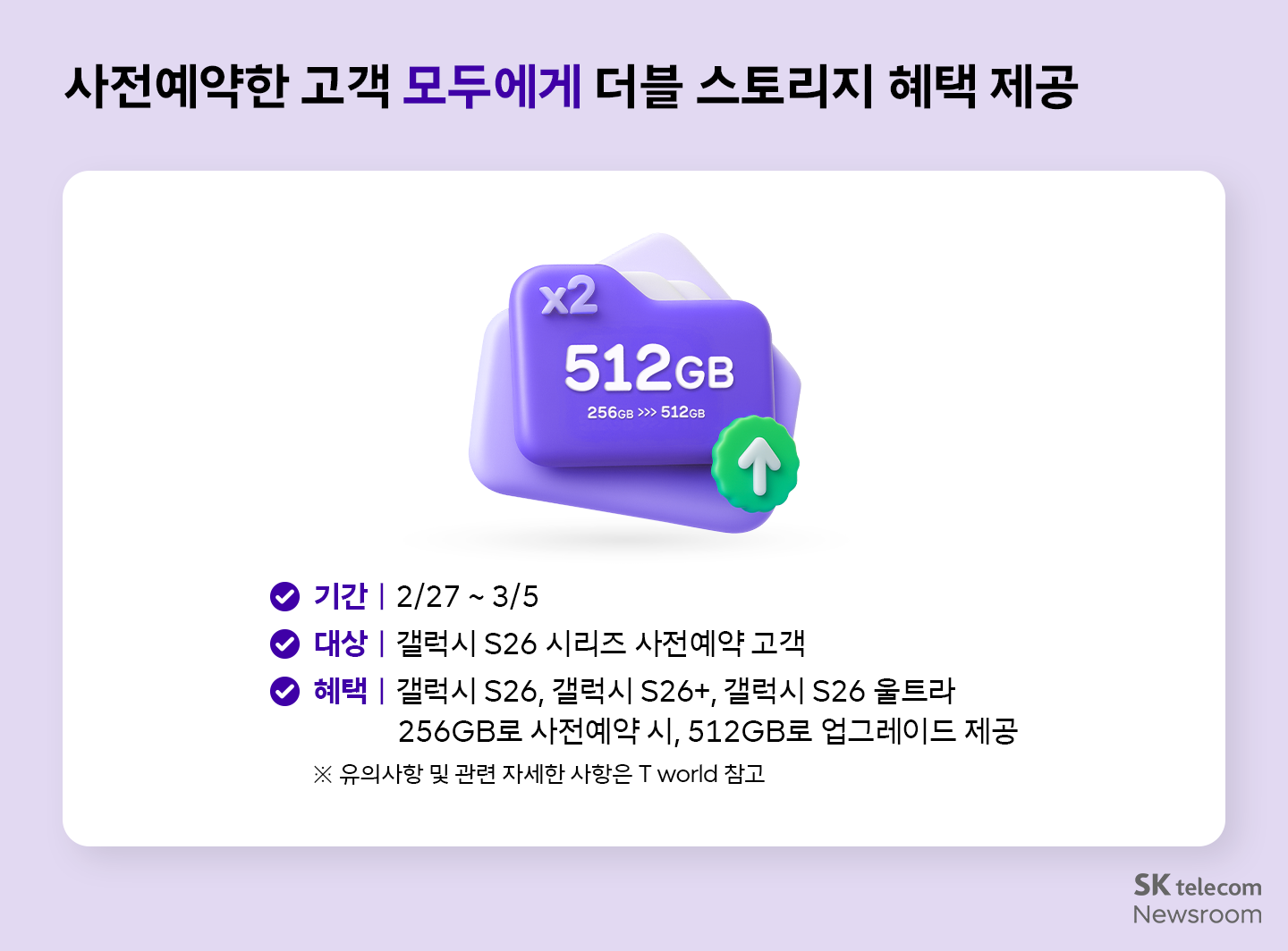 사전예약에 참여한 모든 고객들에게는 단말기 저장 공간을 2배로 업그레이드 해주는 더블 스토리지 혜택이 제공된다. 예를 들어 갤럭시 S26, S26+, S26 울트라 모델을 512GB로 사전예약 시 256GB 모델 가격으로 구매할 수 있다.
