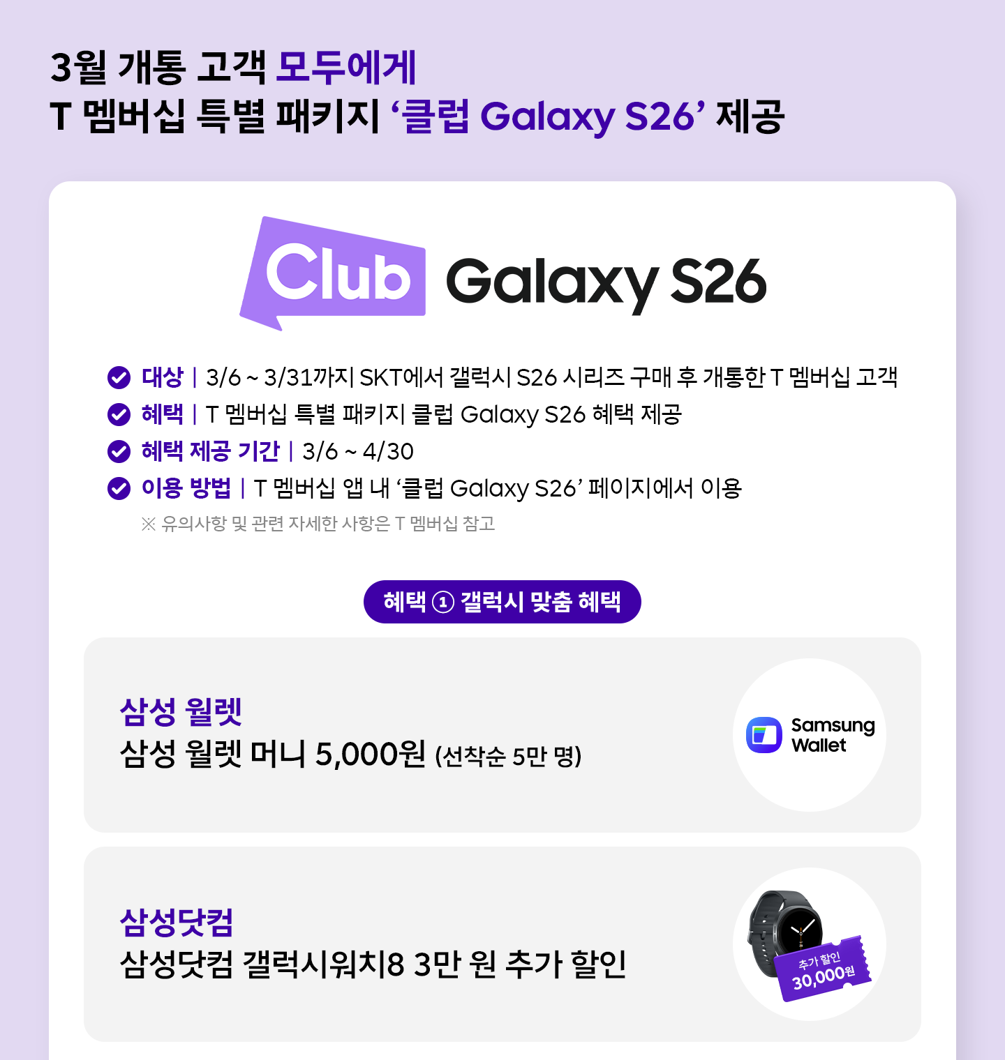 3월 한달 SKT에서 갤럭시 S26 시리즈를 구매 후 개통한 T 멤버십 고객 모두에게는 총 15종의 특별한 멤버십 혜택을 모은 ‘클럽 Galaxy S26’ 패키지가 제공된다.