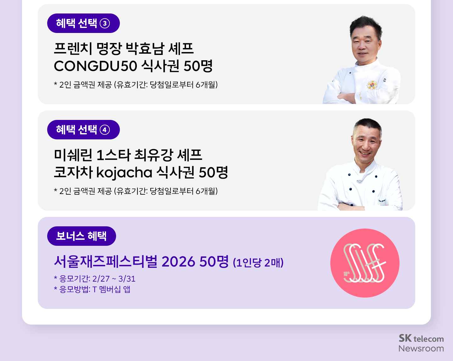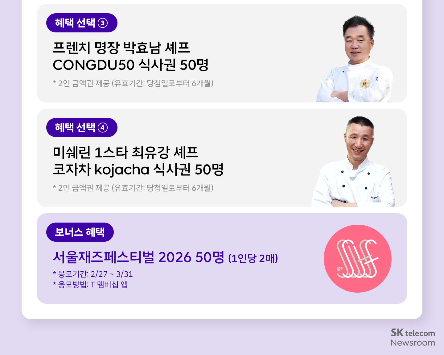 미식과 공연을 좋아하는 고객들에게는 최근 인기 요리 서바이벌 프로그램에 출연해 화제가 된 프렌치 명장 박효남 셰프의 <CONGDU50(여의도 오픈 예정)>와 미슐랭 1스타 최유강 셰프의 <코자차>에서 식사할 수 있는 식사권, 국내 대표 음악 축제인 <서울재즈페스티벌 2026> 참가 티켓이 큰 호응을 얻을 것으로 예상된다.(각 50명씩 추첨 통해 제공)