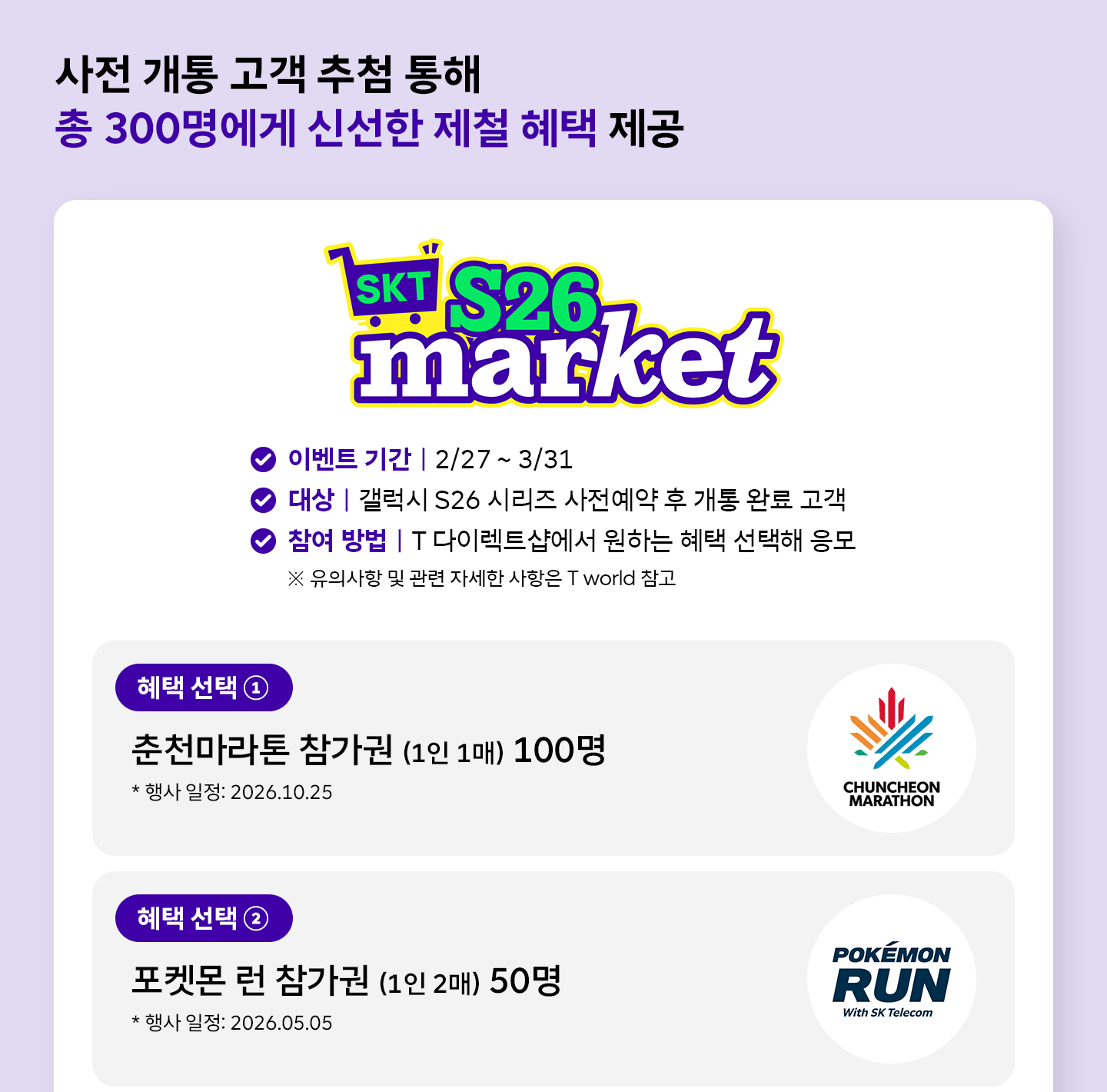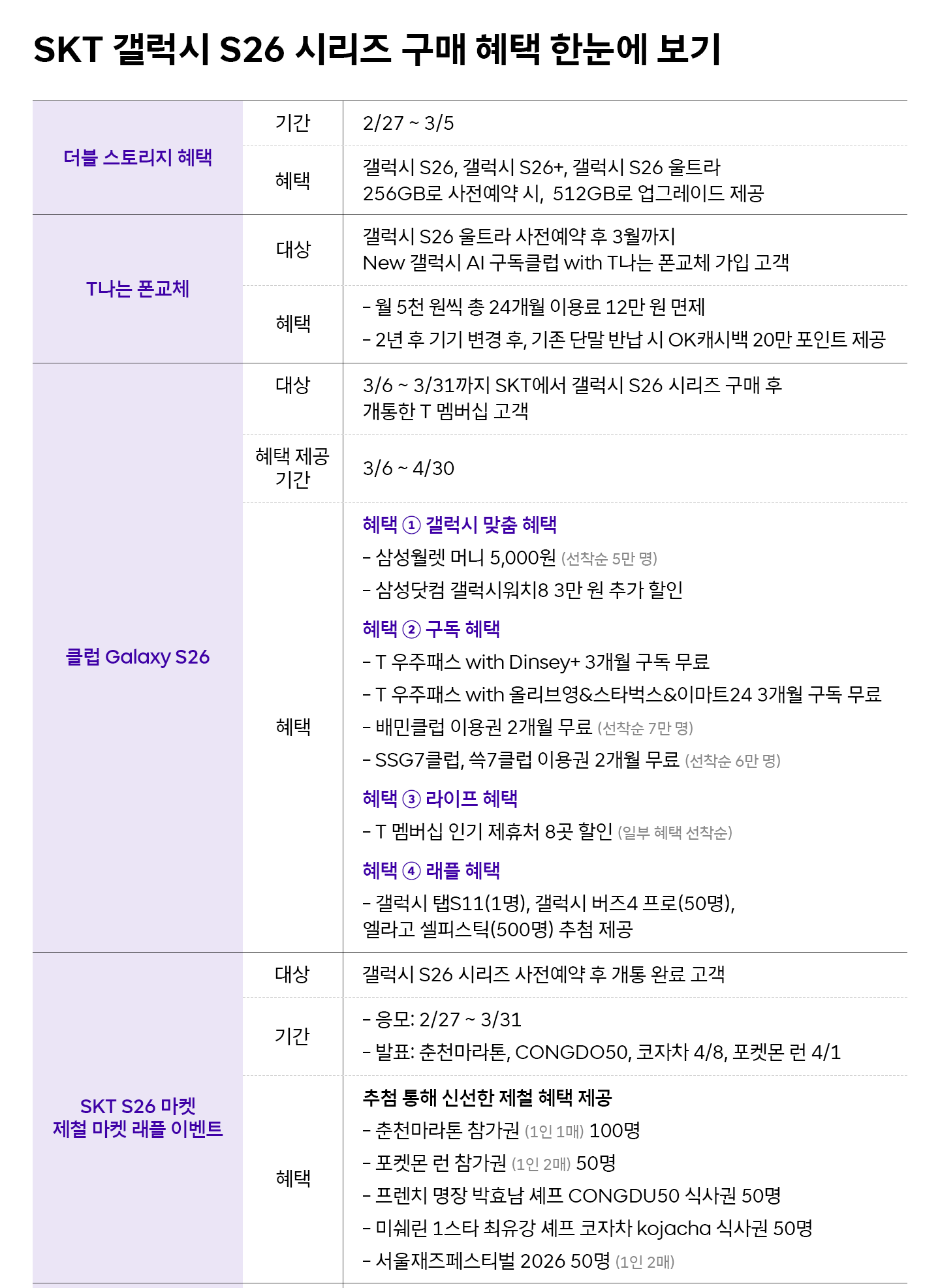 SKT는 갤럭시 S26 시리즈 사전 개통 고객 중 300명을 추첨해 러닝, 공연, 미식 등 평소 치열한 참가 경쟁이 펼쳐지는 인기 행사와 이벤트 등의 참여 기회를 제공하는 ‘신선한 제철 혜택이 가득한 SKT S26 마켓’을 준비했다.