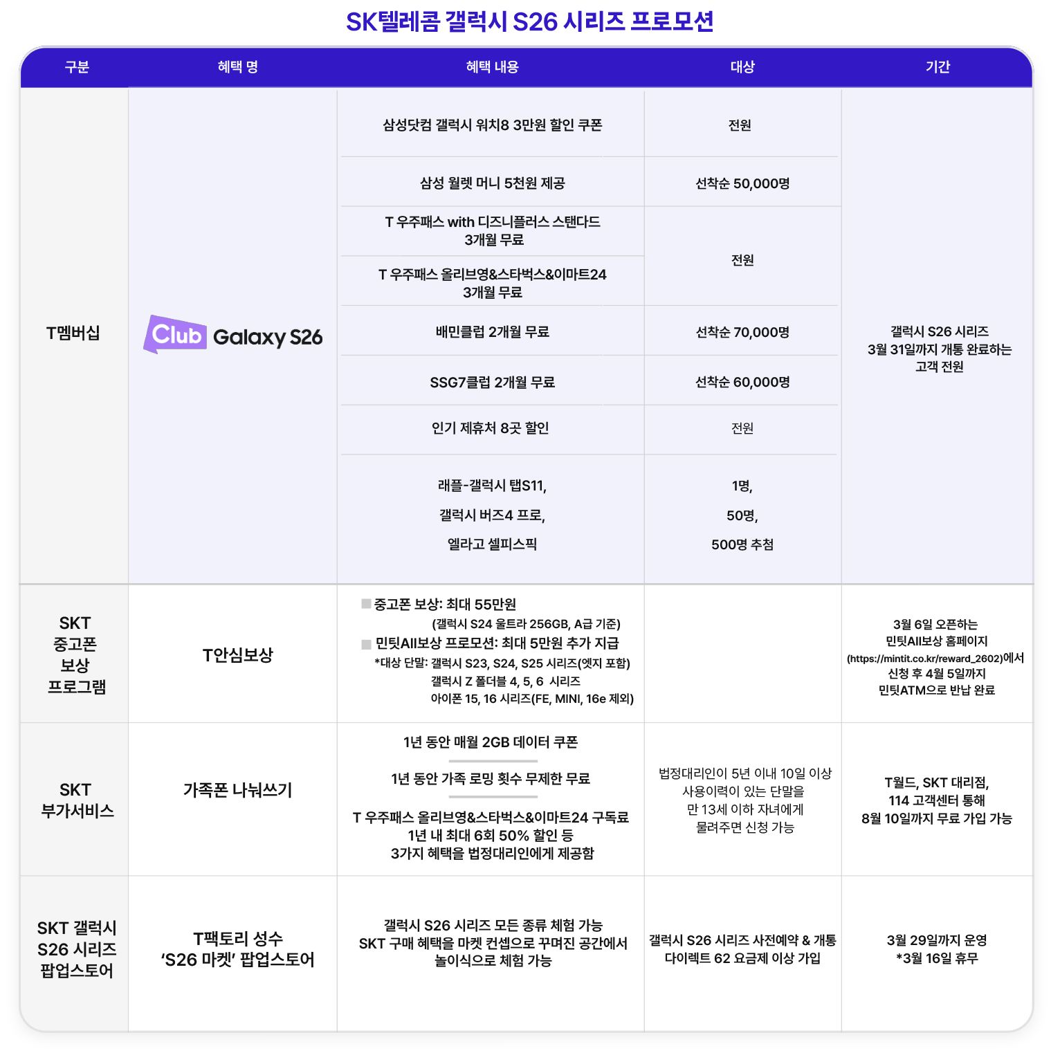 SKT는 3월 31일까지 갤럭시 S26 시리즈 개통 완료 고객 모두에게는 T 멤버십 ‘클럽 갤럭시 S26’ 패키지를 제공한다. 패지키는 구독, 갤럭시 맞춤, 라이프, 래플(추첨) 등 총 4개의 카테고리로 구성된다.
