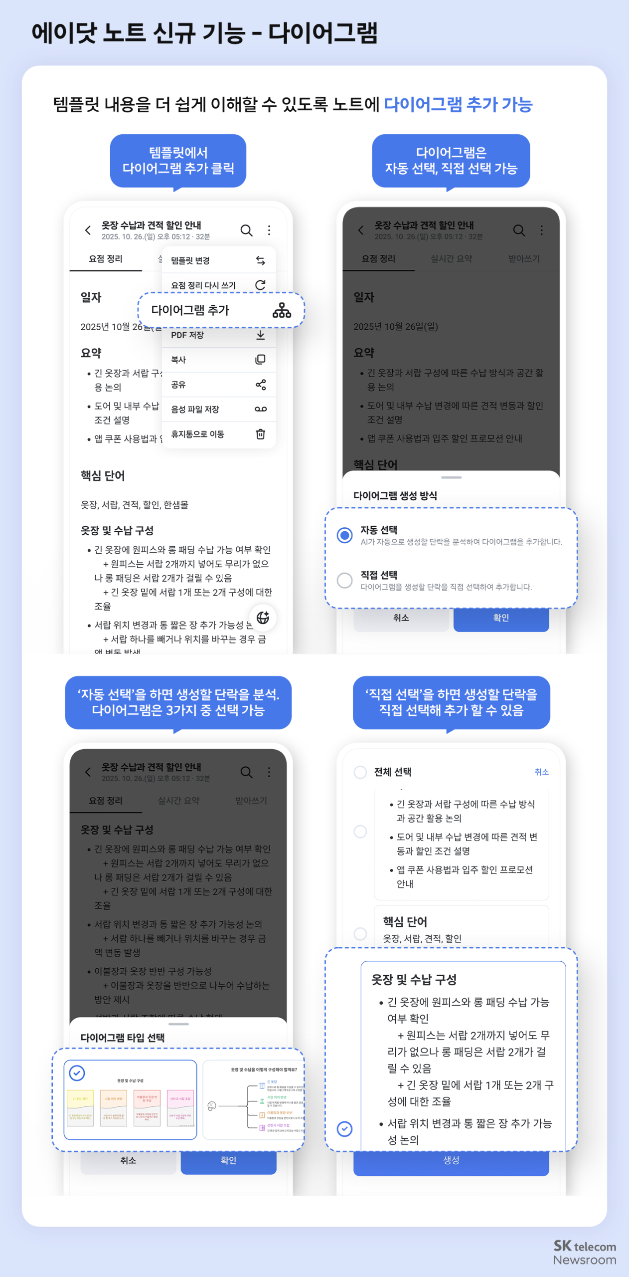 ‘다이어그램’은 텍스트 중심의 노트를 더욱 직관적으로 이해할 수 있도록 시각화해주는 기능이다. 길고 복잡한 설명이나 정보가 많은 내용을 도식화된 형태로 표현해 핵심을 빠르게 파악할 수 있도록 돕는다. 특히, 노트를 공유 받은 사용자가 문서의 구조와 핵심 내용을 더 쉽게 확인할 수 있게 됐다. 다이어그램은 ‘자동 선택’과 ‘직접 선택’ 두 가지 방식으로 생성할 수 있다.