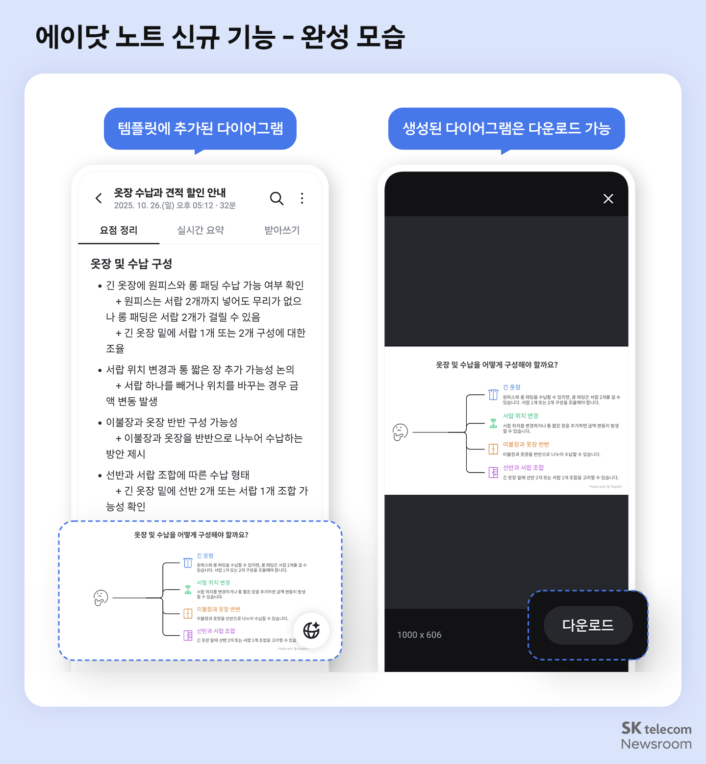 기록은 잘 남기는 것을 넘어, 사용자가 필요한 내용을 쉽게 찾고, 보기 좋게 정리되고, 상황에 맞게 공유할 수 있어야 한다. 에이닷은 이번 에이닷 노트 업데이트를 통해 정리·편집·공유 기능을 한층 강화했다. 여기에 내용을 시각화해주는 ‘다이어그램’ 기능까지 더했다. ‘프로 일잘러’로 거듭날 수 있는 신규 에이닷 노트 기능을 살펴본다.