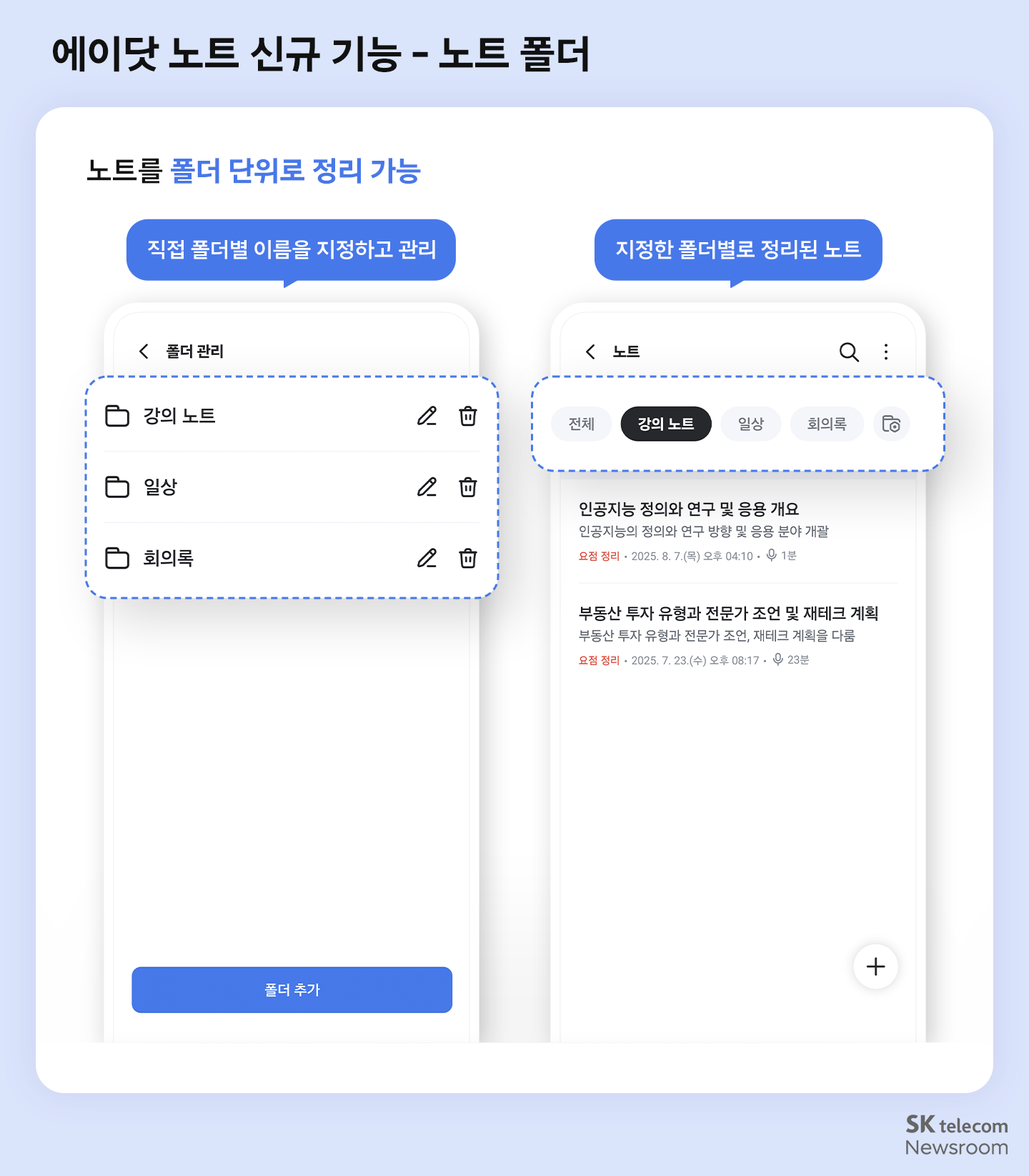 에이닷 노트에 폴더 기능이 새롭게 추가됐다. 기존에는 노트가 최신순으로 생성되기만 하였는데, 이제는 폴더별로 정리가 가능하다. 노트를 폴더 단위로 나만의 기준으로 정돈할 수 있다. 예를 들어, 회의록, 일상, 강의 노트 등 유형별로 구분하거나, 특정 프로젝트 관련 노트만 한 폴더에 정리하거나, 개인과 업무 기록을 분리해 보관하는 식으로 다양하게 가능하다. 폴더명 역시 자유롭게 설정할 수 있다. 단순 저장을 넘어, 필요한 노트를 빠르게 찾아보고 흐름 있게 관리할 수 있어 활용도가 높다.