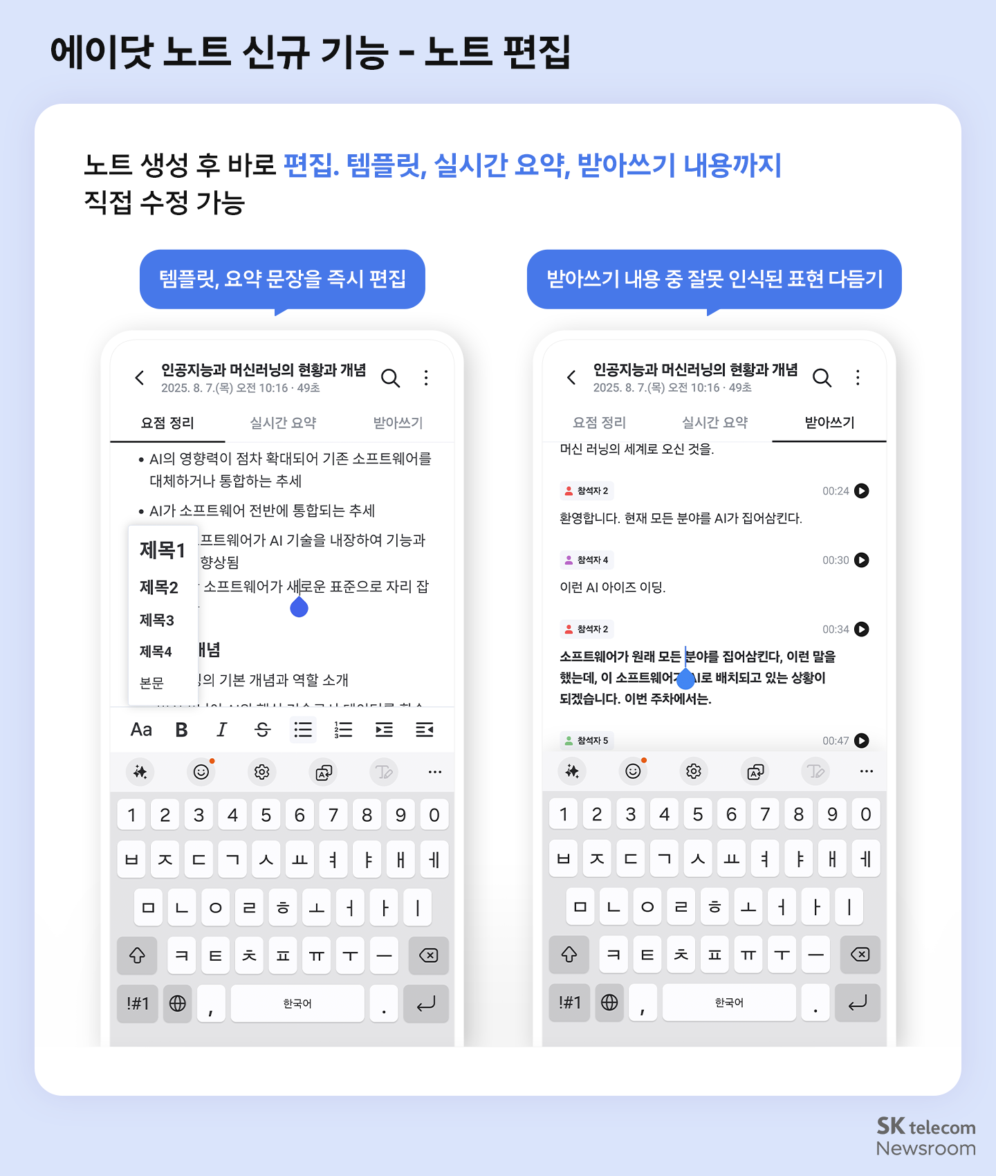 지난 2월, 대화의 맥락을 짚어주는 ‘리더 회의록’과 음성 녹음 메모에 특화된 ‘생각 노트’ 템플릿 업데이트에 이어, 이번 에이닷 노트 업데이트는 사용자 경험 개선에 집중해 일상의 효율을 높이는 데 초점을 맞췄다. 이번 업데이트로 일상의 기록을 더욱 체계적으로 관리해 보길 추천한다.