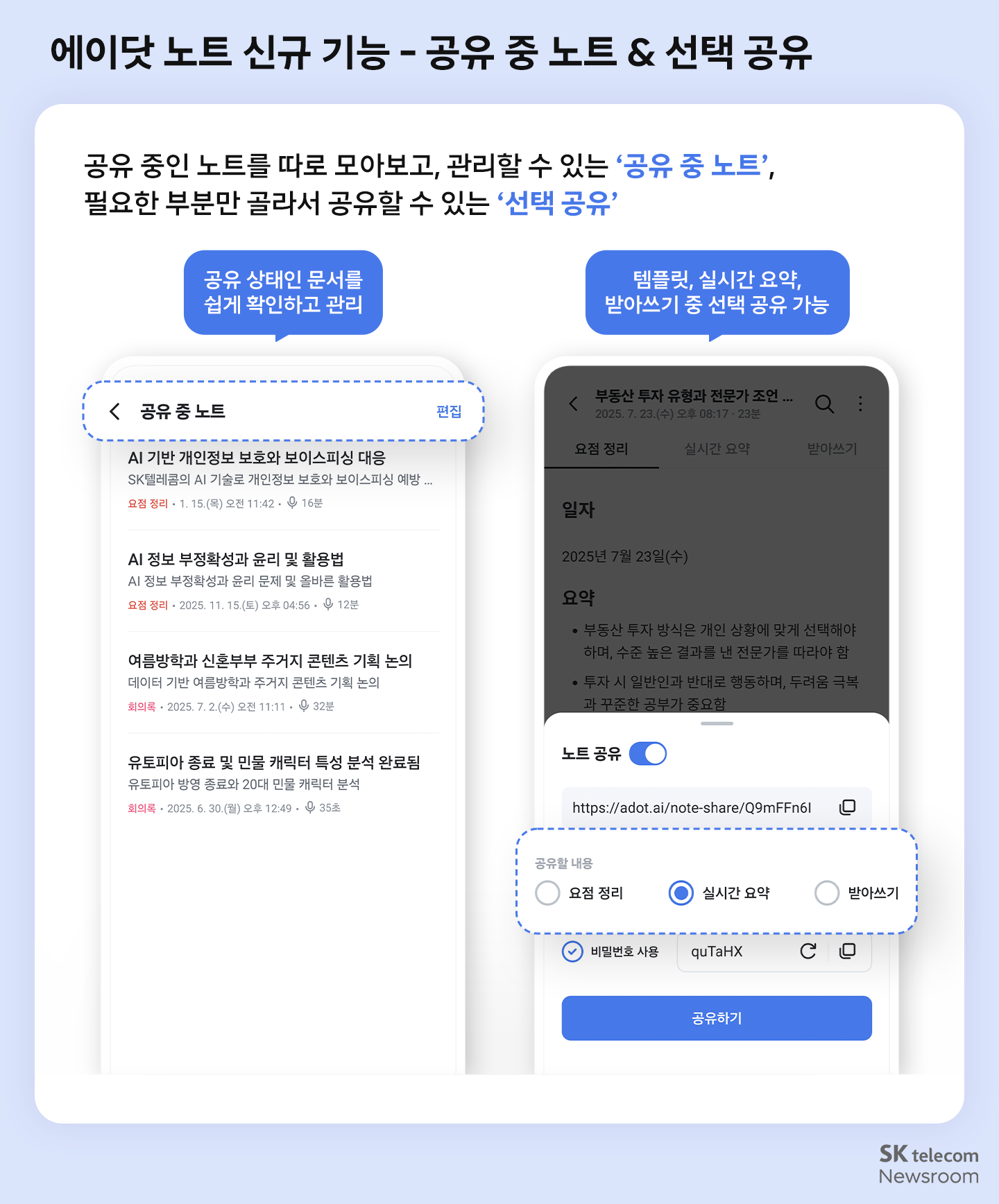 또한, 필요한 내용만 골라 공유할 수 있는 ‘선택 공유’ 기능도 새롭게 도입됐다. 상황에 따라 받아쓰기 내용은 제외하고 템플릿만 전달하거나, 핵심 요약만 공유하고 싶을 때 유용하다. 이제 에이닷 노트에서 공유 시 템플릿, 실시간 요약, 받아쓰기 중 원하는 항목만 선택해 공유할 수 있다. 예를 들어, 팀 회의록은 요약이나 정리된 템플릿 내용만 전달하거나, 인터뷰에서는 받아쓰기 내용만 공유하는 등 상황에 맞는 깔끔한 공유가 가능하다.