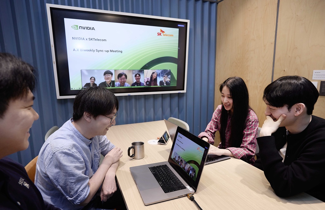 SK텔레콤 을지로 본사에서 AI 모델 개발자들이 엔비디아 담당자들과 원격 회의를 진행하는 모습