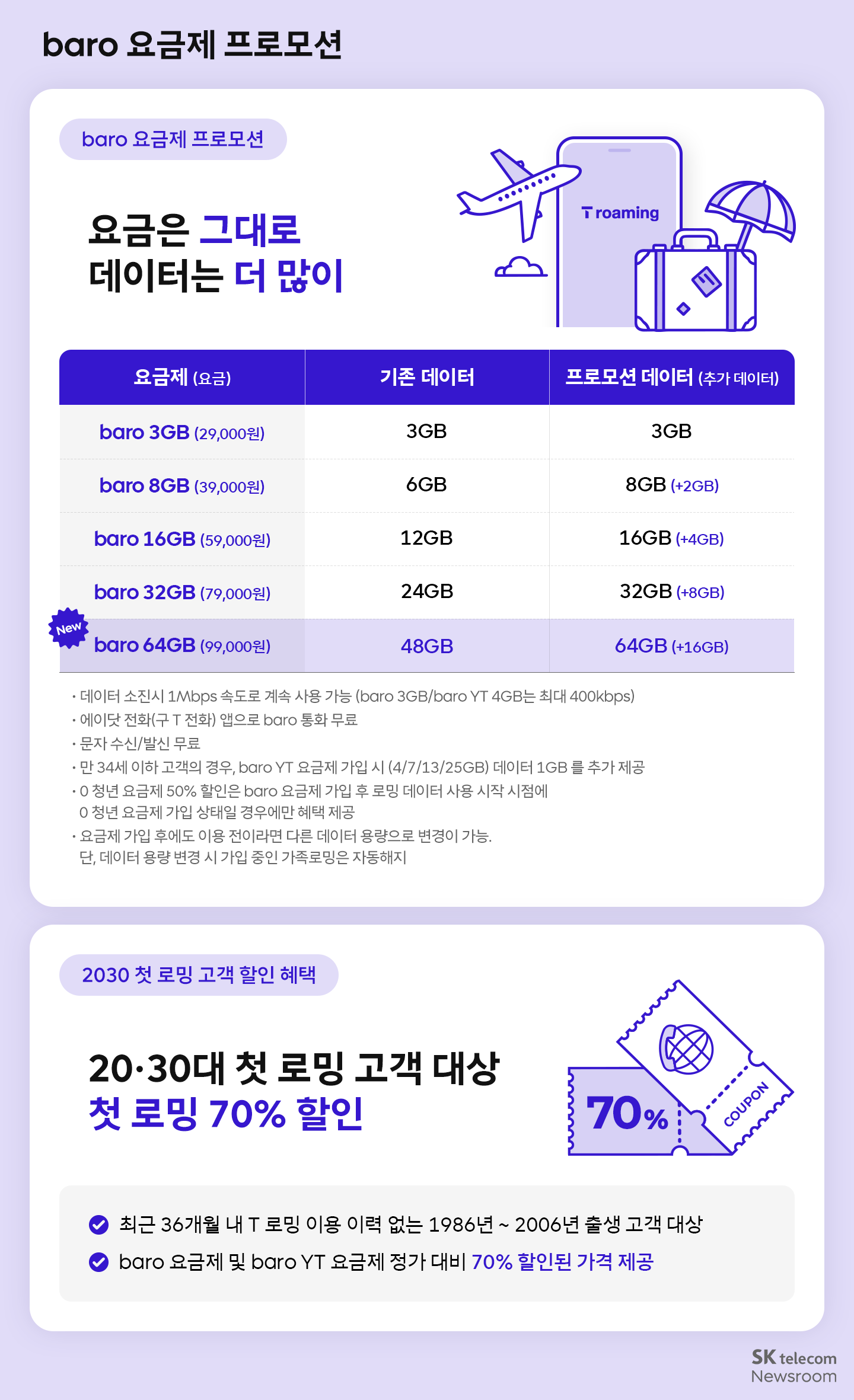 또한, 로밍 이용이 처음이거나 오랜만인 2030 고객을 위한 ‘첫 로밍 70% 할인’ 프로모션도 함께 진행된다. 최근 36개월 내 T 로밍 이용 이력이 없는 1986년~2006년 출생 고객이 대상으로, baro 요금제 전 구간을 정가 대비 70% 할인된 가격에 이용할 수 있다. 예를 들어 baro 8GB 요금제의 경우, 정가 39,000원에서 할인 혜택을 적용하면 11,700원에 이용 가능하다.
