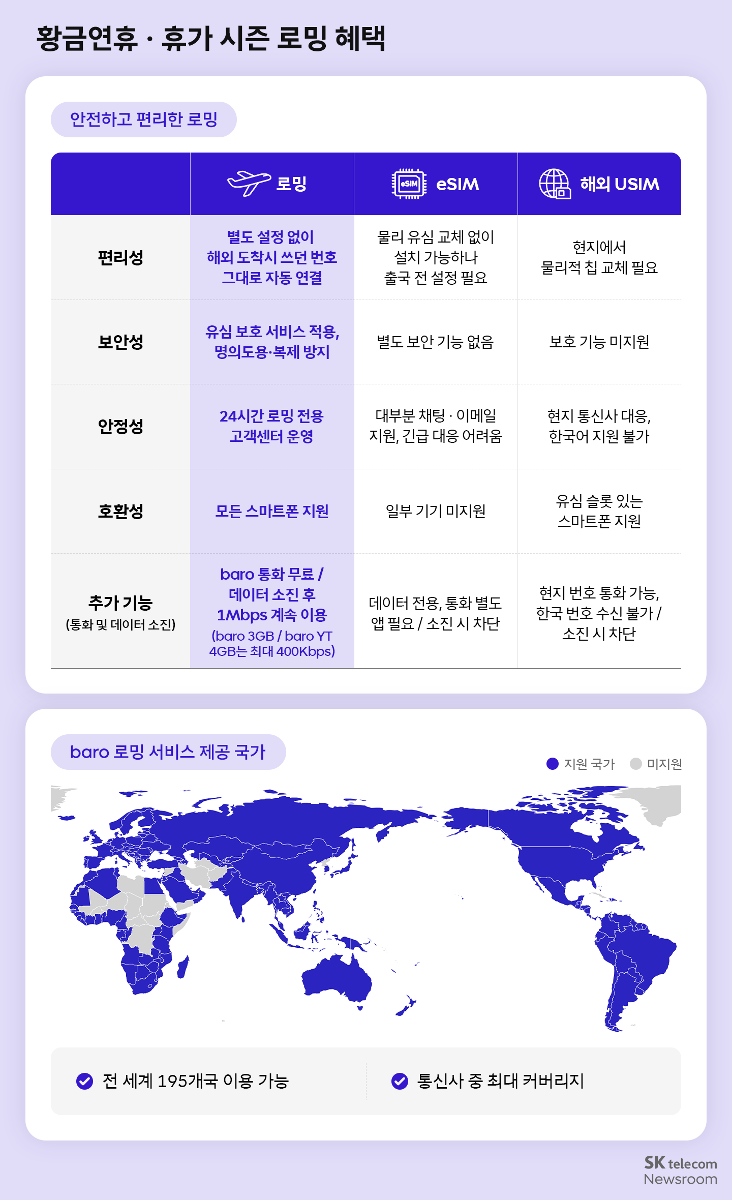 SK텔레콤 로밍이 좋은 이유는 단순한 가격 메리트에 그치지 않는다. ▲별도의 앱 설치나 설정 변경 없이 해외 도착 즉시 자동으로 연결되는 편리함 ▲기존 한국 번호 그대로 사용 가능한 통신 환경 ▲주식·온라인 뱅킹 등 민감한 앱 사용 시에도 안정적인 유심 보호 기능 ▲24시간 운영되는 T 로밍 고객센터 ▲데이터 소진 후에도 최대 1Mbps 속도로 계속 사용 가능한 혜택까지, eSIM이나 현지 유심과 비교했을 때 얻을 수 없는 프리미엄 경험을 제공한다. 특히 baro 요금제는 전 세계 195개국에서 이용 가능하다는 장점이 있다. 이는 우리나라 사람들이 즐겨 방문하는 해외 여행지의 대부분을 포함할 뿐만 아니라 국내 통신사 중 가장 넓은 커버리지를 자랑한다.