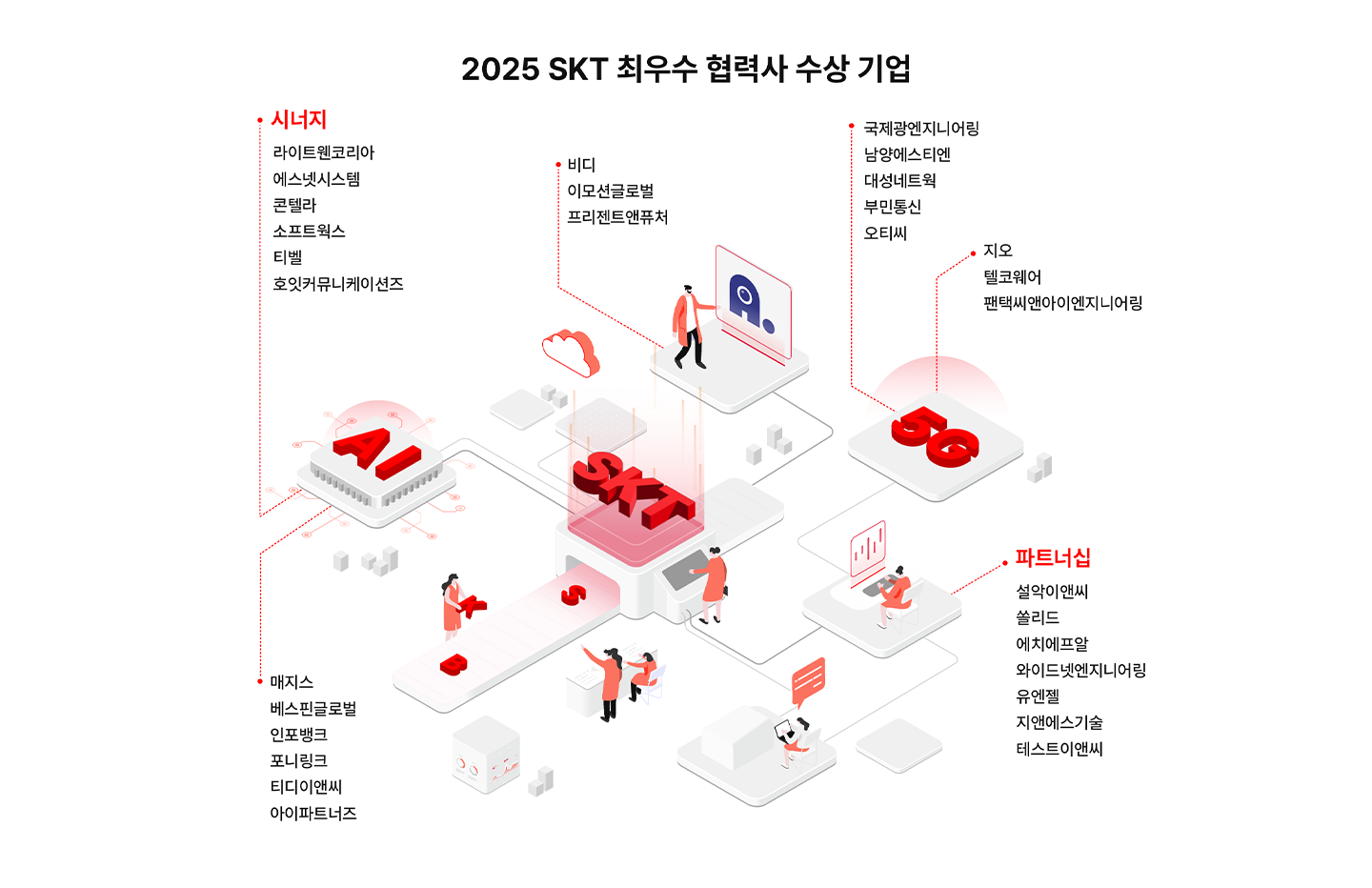 시너지 부문에는 통신 서비스와 네트워크∙AI 등 SKT의 주요 서비스 고도화에 기여하고, B2B(엔터프라이즈) 프로젝트를 성공적으로 수행한 23개사가 선정됐다. 파트너십 부문에서는 동반성장 활동에 적극 참여하고, ESG 경영 체계 구축에 앞장선 7개사가 수상했다.