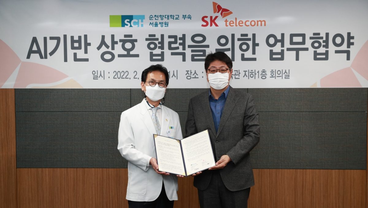 프레스센터 / 보도자료 SKT, 순천향대학교 부속 서울병원과 AI 기반 돌봄콜 업무 협약 체결 SK텔레콤이 순천향대학교 부속 서울병원(이하 순천향대서울병원)과 퇴원 환자 건강관리를 위한 AI 기반 돌봄콜 업무 협약을 23일 체결했다. 2022.02.23 다운로드 받기 보도자료 보도사진