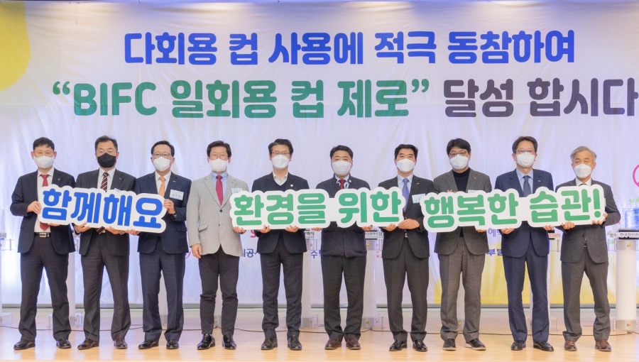 SK텔레콤과 부산광역시, 부산국제금융센터(BIFC)에 입주 기관 7곳이 다회용컵 이용 확산을 위해 손을 맞잡았다.2022.12.15 -
