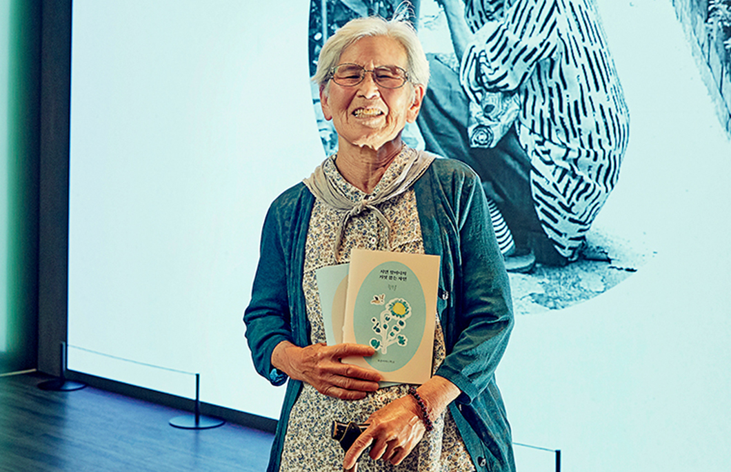 기업뉴스 / ESG “살아보니 행복한 날 더 많더라” 할머니 시인, 황보출 작가가 전하는 용기 SKT는 사옥 내 미디어 월을 통해 전시 기회를 제공하고 있다. 6월에는 특별한 작가님이 미디어 아트전을 찾았다. 여든 줄에 시집을 내놓은 황보출 작가님이다. 2021.06.09
