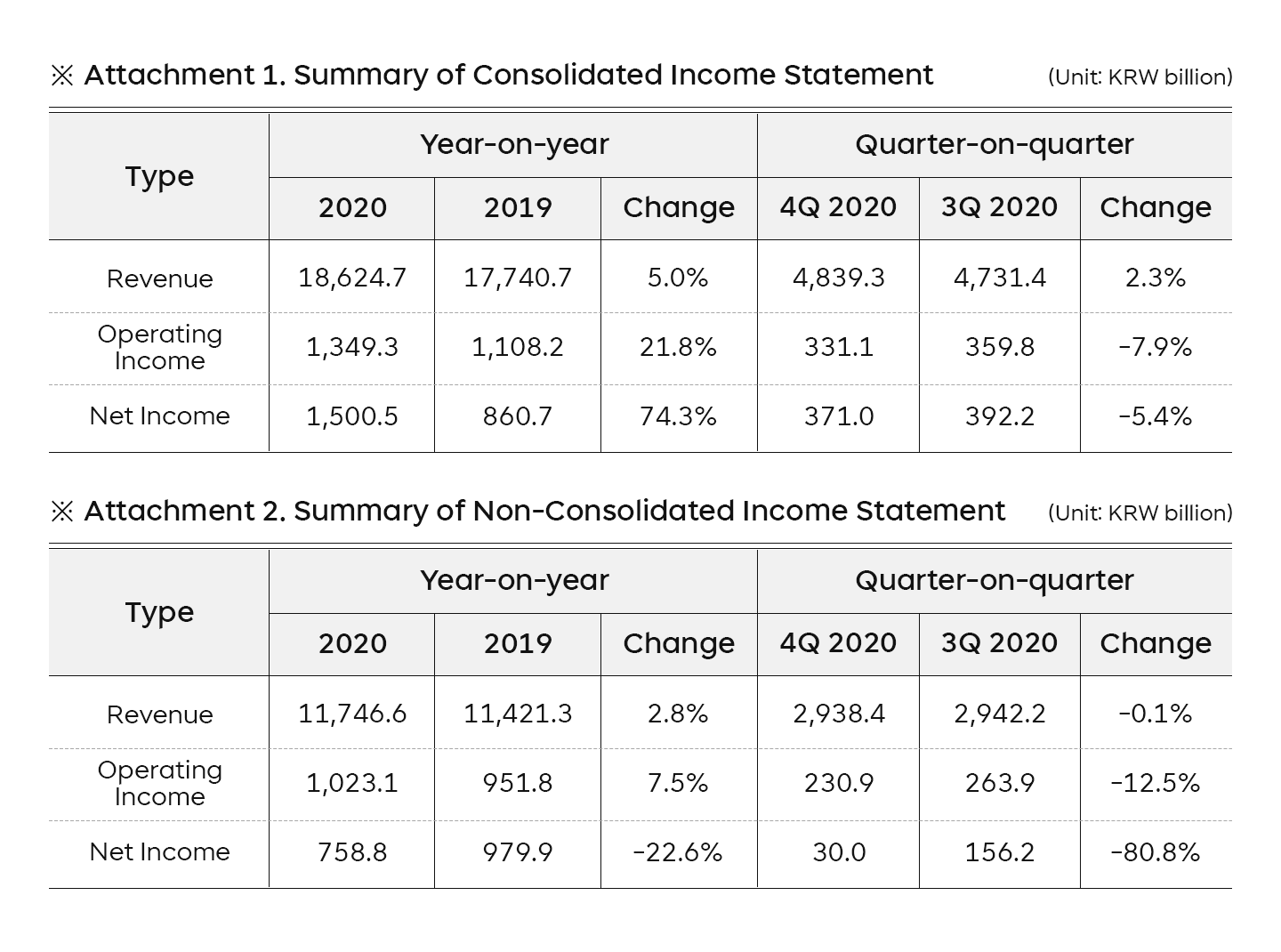 • Posts revenue of KRW 18.625 trillion, operating income of KRW 1.349 trillion, and net income of KRW 1.501 trillion