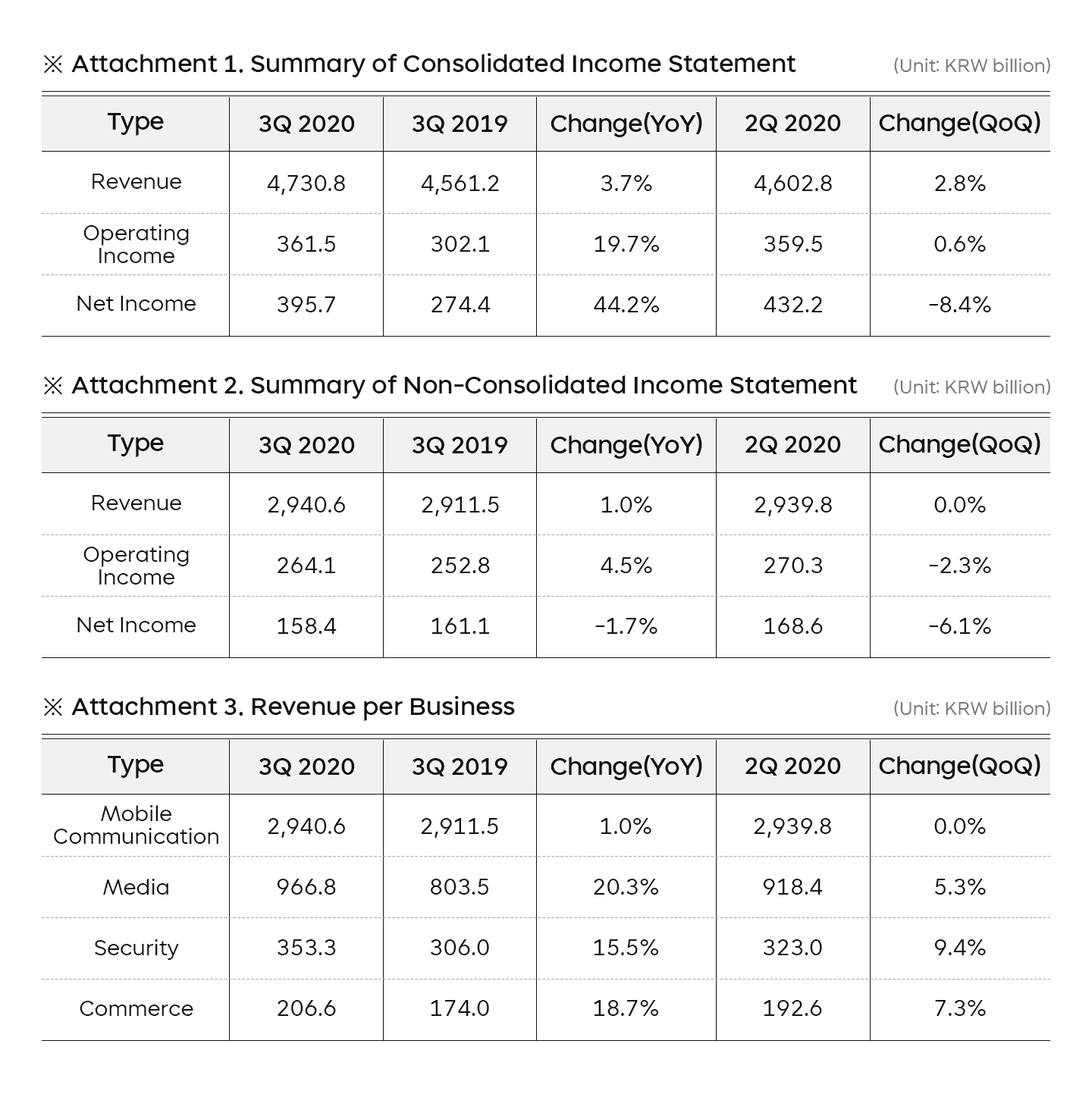• For the third quarter of 2020, the company posts revenue of KRW 4.731 trillion, operating income of KRW 361.5 billion and net income of KRW 395.7 billion.