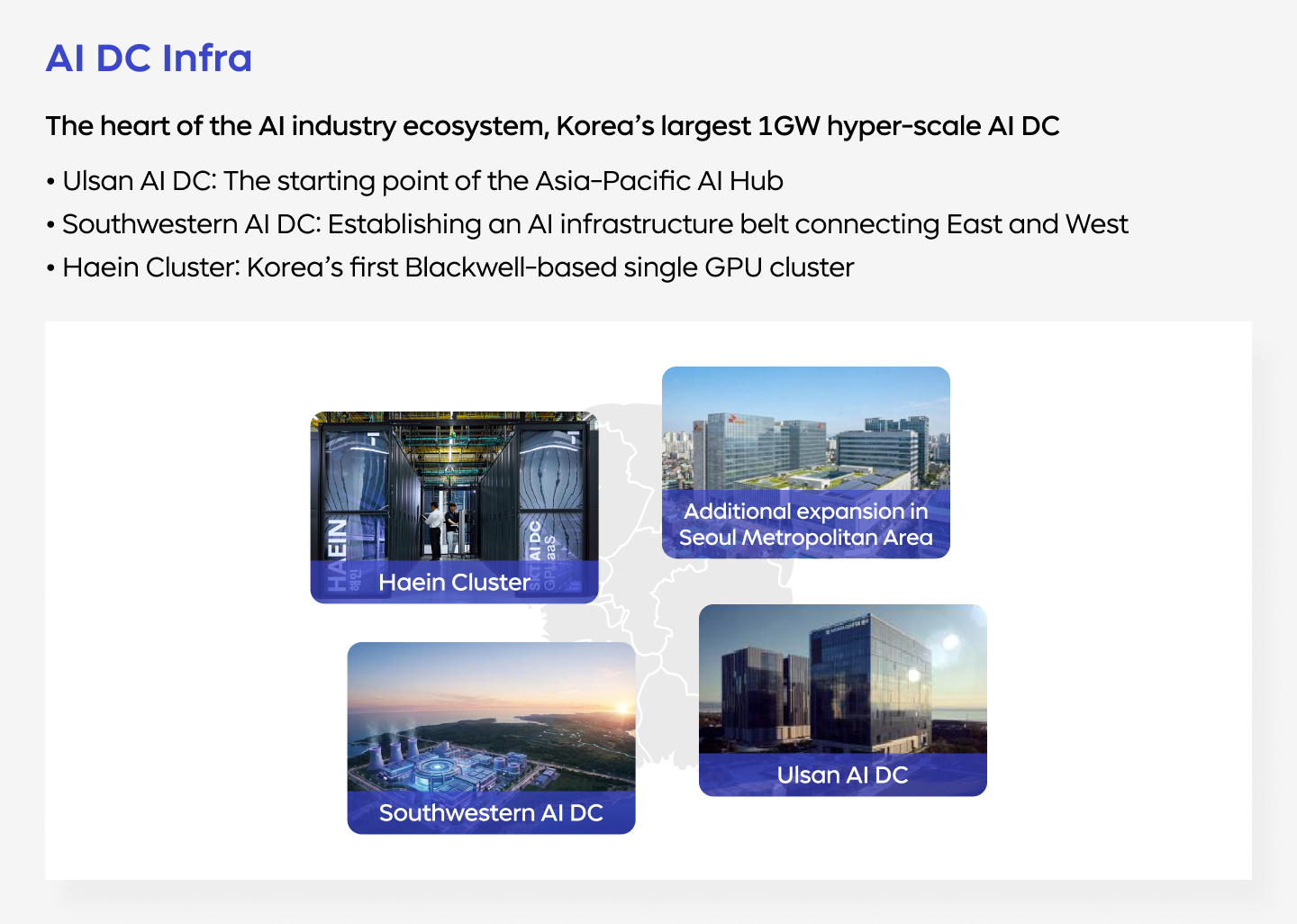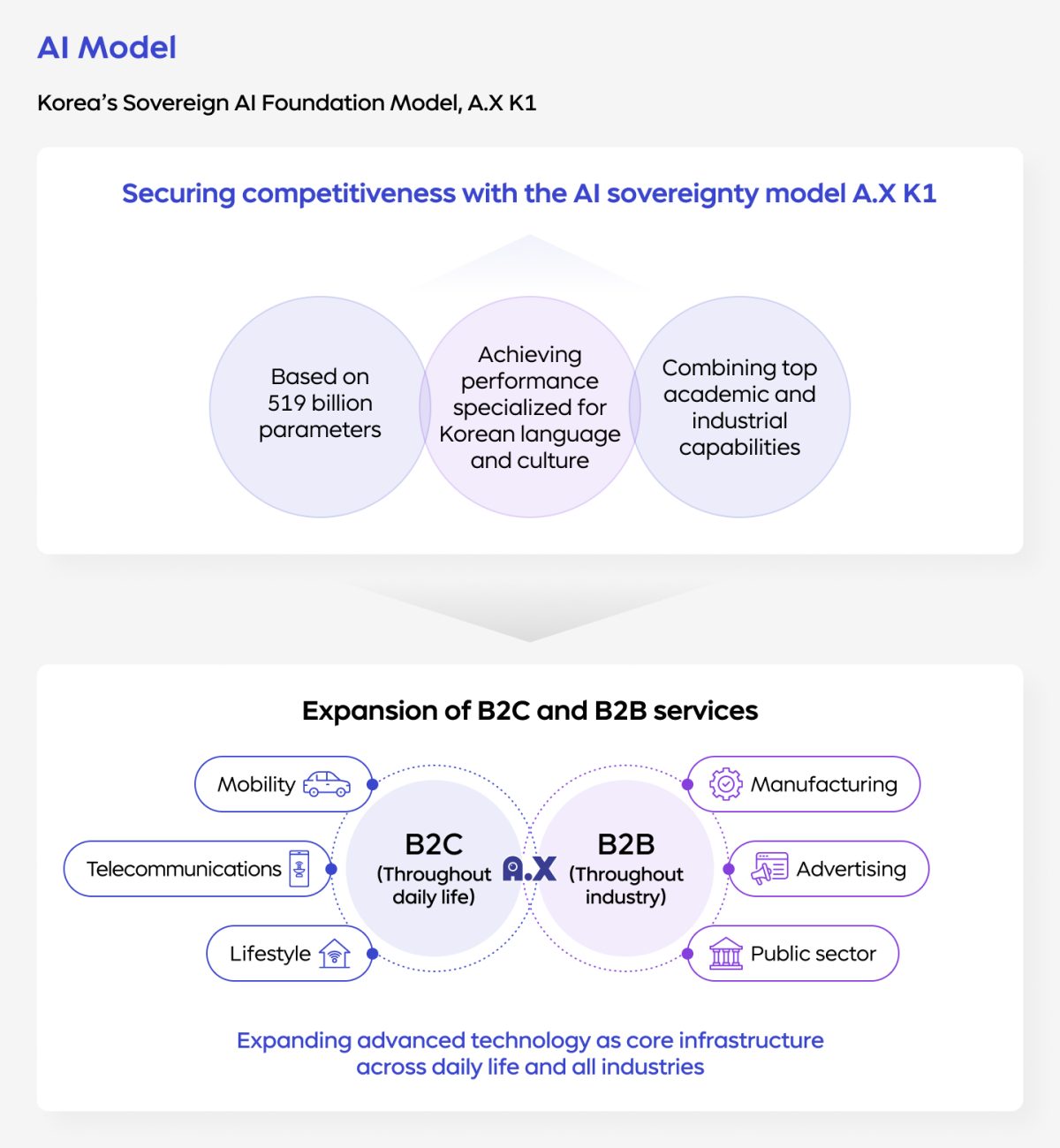 SKT is contributing to Korea’s Sovereign AI and its leap toward becoming a global AI G3 with the nation’s only full-stack AI capability spanning from AI DC-based infrastructure and the A.X K1 model to the A. (A-dot) service.