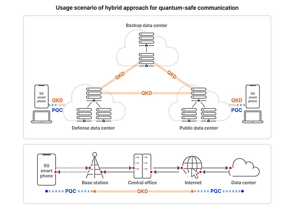 For instance, for communication from data center to smartphones, QKD can be applied to sections covered by the fixed-line network (i.e. data center – internet – central office – base station), whereas PQC can be applied to sections covered by wireless networks (i.e. base station – smartphones) to safeguard the end-to-end communication in an efficient manner.