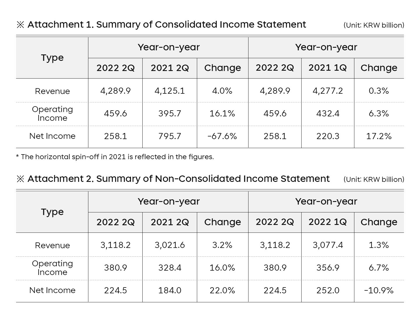 SK Telecom (NYSE:SKM, hereinafter referred to as “SKT”) today announced its earnings for the second quarter of 2022 on a K-IFRS consolidated basis: revenue of KRW 4.290 trillion, operating income of KRW 459.6 billion, and net income of KRW 258.1 billion.