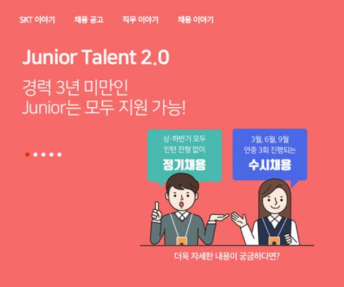 프레스센터 / 보도자료 SKT, 획일화된 채용전형 바꾸고 취준생과 열린 소통 나서 18일까지 ‘주니어 탤런트’ 모집, 실무형 인재 채용 적재적소 배치되도록 혁신한다. 채용시점 연 3회 이상으로 확대하고, 직무별 면접 차별화해 변별력 제고한다. 2021.04.07 다운로드 받기 보도자료 보도사진